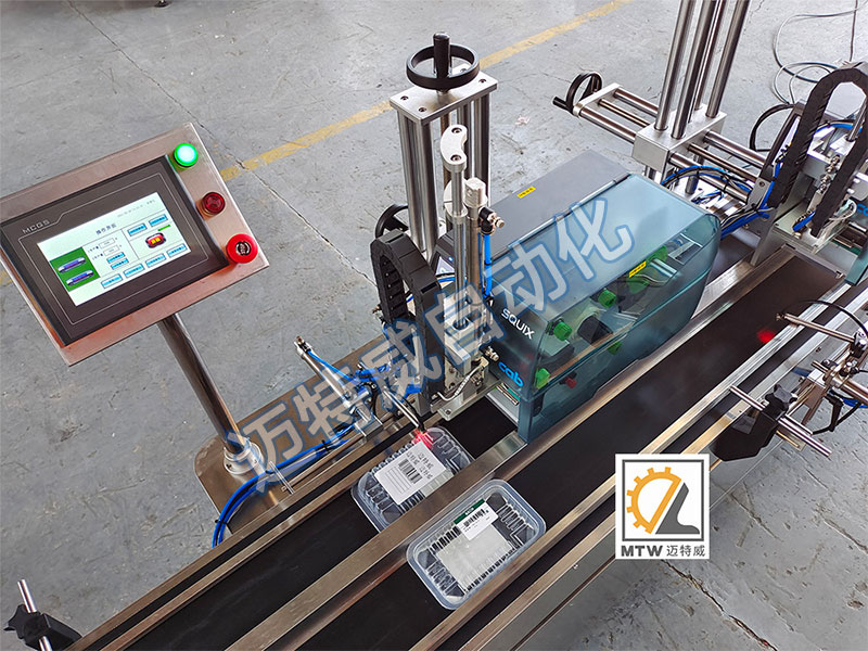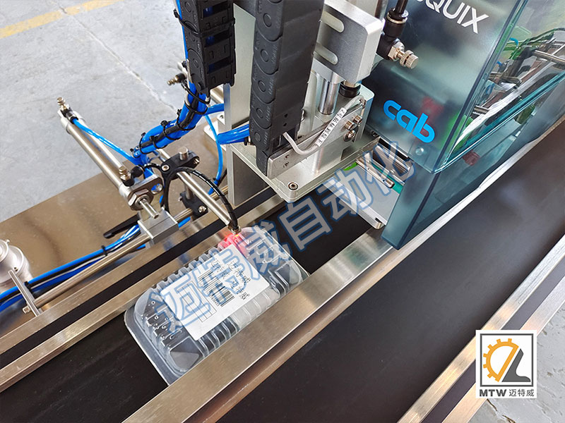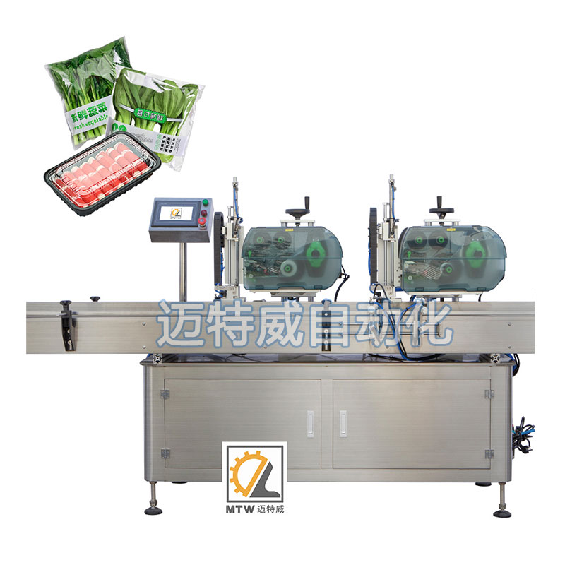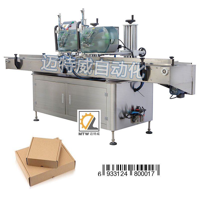 該設備用于瓶子、盒子、成型包、包裝箱等上平面的打印和貼標,可貼一張或兩張標??稍诳瞻讟嘶蝾A留標上在線即時打印生產日期批號、序列號、條形碼、二維碼、品名、專銷區等預設內容并完成同步貼標。