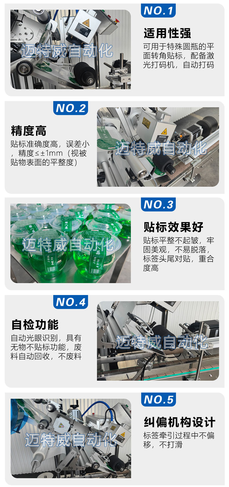 圓瓶平面轉角貼標機+激光打碼機可滿足不同圓瓶的平面轉角貼標,如塑料瓶、玻璃瓶等上平面轉角貼標,兼容性強。
