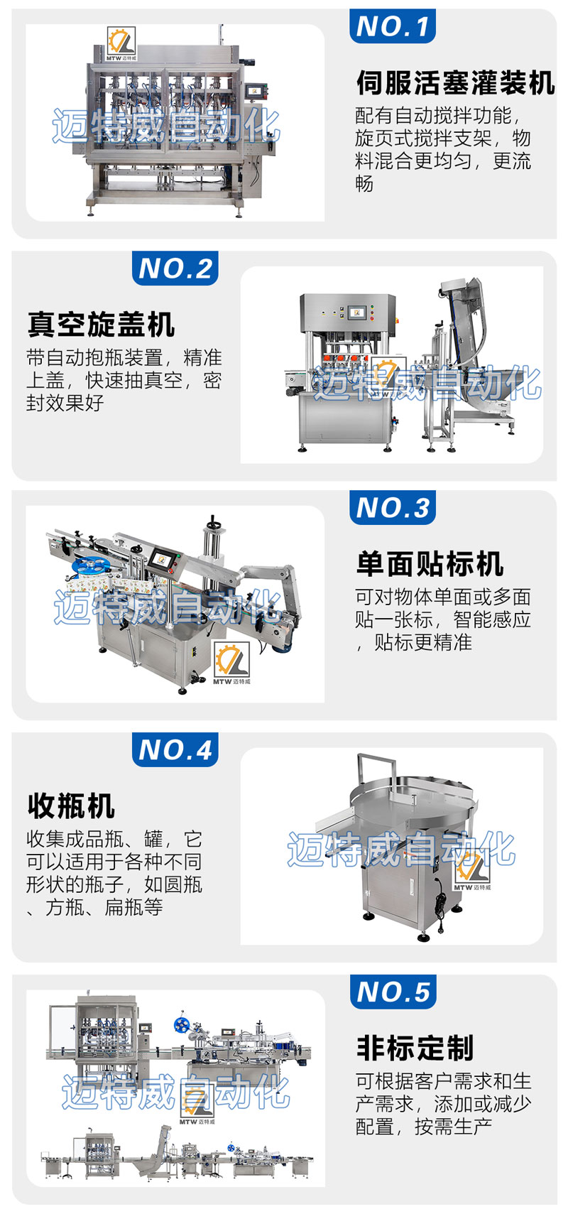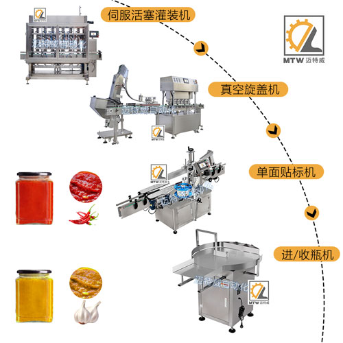 醬料灌裝生產(chǎn)線:伺服活塞灌裝機+真空旋蓋機+方瓶單面貼標機+收瓶機